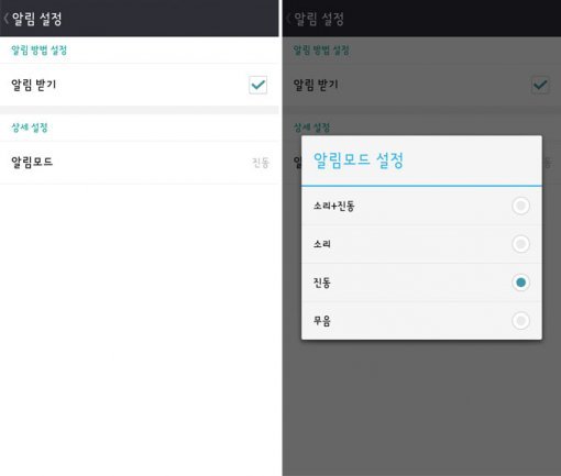 알림 설정 메뉴에서는 알림을 받을 것인지 아닌지, 알림 모드는 어떻게 할지 설정할 수 있다. 알림 모드는 소리+진동, 소리, 진동, 무음 등 4가지다.