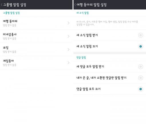 좀 더 세부적인 설정은 '그룹별 알림 설정' 메뉴에서 할 수 있다. 우선, 그룹별로 알림 설정을 각각 다르게 할 수 있다. 새 소식 알림을 받거나 알림을 끌 수 있다. 댓글 알림 설정도 가능하다. 새 댓글을 모두 알림 받거나, 내가 쓴 글과 내가 소환된 댓글만 알림을 받거나, 댓글 알림을 모두 끌 수 있다.