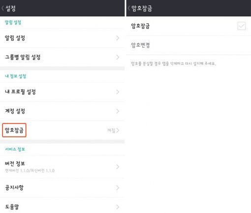 이제 카카오그룹을 실행하면 카카오그룹 암호를 입력해야 한다. 암호 기능을 해제하고 싶다면 암호 잠금 설정에서 V표 체크를 없애면 된다.