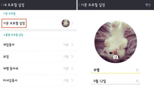 프로필 설정 메뉴에서 기본 프로필 및 그룹별 프로필을 설정할 수 있다. 기본 프로필을 설정하는 방법은 간단하다. 사진, 이름, 생일을 입력하면 된다.