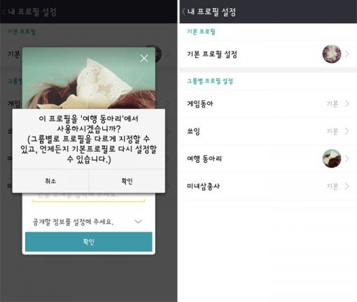 프로필 수정이 끝나면 '확인' 버튼을 누른다. 그룹별로 프로필을 다르게 지정하더라도 언제든지 기본 프로필로 다시 설정할 수 있다. 다른 프로필을 설정했다가 기본 프로필로 돌아가고 싶다면, 사진 변경 버튼을 눌러서 '기본 프로필 가져오기' 메뉴를 선택하면 된다.