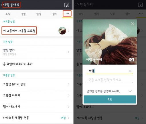 프로필 사진 부분을 터치하면 사진을 변경할 수 있다. 각각의 그룹에 맞춰 자신의 개성을 뽐내자.
