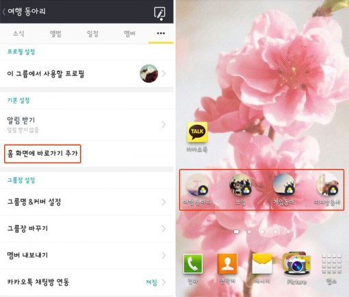 카카오그룹 앱에 일일이 접속해 그룹을 확인하는 것이 귀찮다면, 홈 화면에 바로가기를 추가하면 된다. 원하는 그룹으로 들어간 뒤, 오른쪽 상단에 있는 메뉴 버튼(… 모양)을 누르자. 여기서 '홈 화면에 바로가기'를 누르기만 하면 스마트폰 바탕화면에 해당 그룹의 바로가기가 생성된다.