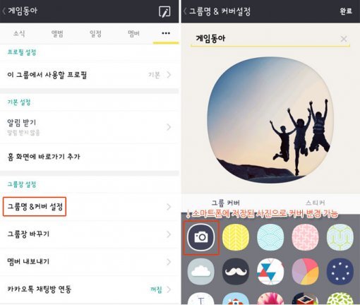 그룹장이 그룹명과 커버 설정을 바꾸는 방법은 다음과 같다. 먼저 원하는 카카오그룹에 들어간 뒤, 오른쪽 상단에 있는 메뉴 버튼(… 모양)을 눌러 설정 화면으로 진입한다. 여기서 '그룹명 & 커버 설정'을 선택하면 된다. 스마트폰에 저장된 사진으로 커버를 설정하고 싶다면 커버 란에서 카메라 모양 아이콘을 누르면 된다.