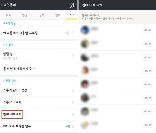 그룹장은 '멤버 내보내기'를 선택하고 원하는 멤버를 선택해, 해당 멤버를 그룹에서 탈퇴시킬 수 있다. 아직 카카오그룹 초대를 수락하지 않은 멤버를 선택하면 그룹 초대가 취소된다. 이 기능은 멤버를 잘못 초대했을 때 이용할 수 있겠다.