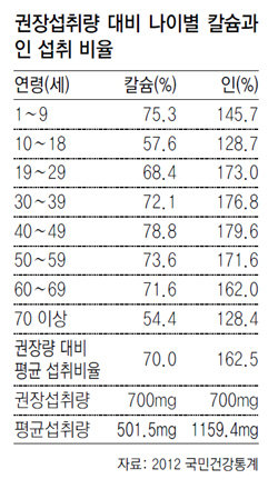 하지만 한국인의 칼슘과 인의 평균섭취량은 권장섭취량과 크게 다른 것으로 확인됐다. 2012 국민건강통계에 따르면 칼슘 섭취량은 501.5mg으로 권장량의 70%에 불과하지만 인은 1159.4mg을 먹어 권장량의 162.5%로 나타났다. 인을 칼슘보다 2.3배나 많이 먹는다는 것이다. 특히 19∼29세 성인의 경우 칼슘은 68.4%로 적게 먹으면서 인은 173%나 많이 먹었다.
