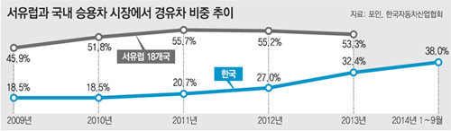 지난달 일본 자동차전문 조사기관 포인에 따르면 독일 영국 프랑스 등 서유럽 18개국에서 한 해 승용차 판매량 중 경유차의 비중은 2011년 55.7%로 최고점을 찍은 뒤 2012년 55.2%, 2013년 53.3%로 하락했다. 유럽발 재정위기 시기엔 비용에 민감한 법인차량이 시장을 떠받쳐온 만큼 경유차가 많이 팔렸지만 최근엔 일반인의 자동차 소비가 증가하면서 진동과 소음이 적은 휘발유차 판매량이 증가하고 있다는 분석이 제기된다. 경유차에 대한 배출가스 규제인 ‘유로6’ 시행으로 차 가격이 오른 점, 환경에 대한 인식도 영향을 준 것으로 풀이된다.