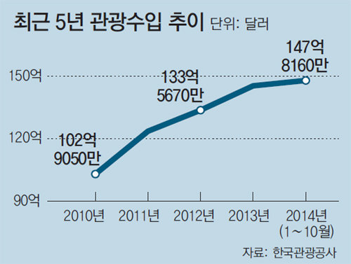 중국인 여행객 39% 증가 힘입어… 2014년 관광수입 10개월새 역대 최고