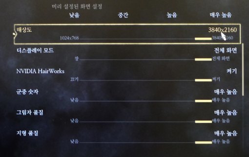제품의 대략을 살펴봤으니 이제는 실제로 게임을 구동하며 체감 성능을 살펴볼 차례다. 코어 i7-4770 CPU에 8GB 메모리, 인텔 353 SSD(120GB)로 구성된 윈도 8.1 기반 시스템에 라데온 R9 퓨리X를 장착해 게임을 플레이 해봤다. 게임 테스트는 모든 그래픽 품질을 최상으로 높인 상태에서, 화면 해상도는 풀HD급인 1,920 x 1,080 모드와 4K UHD급인 3,840×2,160 모드(VSR)를 번갈아가며 진행했다. 참고로 초당 30프레임 정도라면 원활하게 게임을 진행할 수 있는 수준, 초당 60프레임 이상이라면 더할 나위 없이 쾌적한 수준이라 할 수 있다.