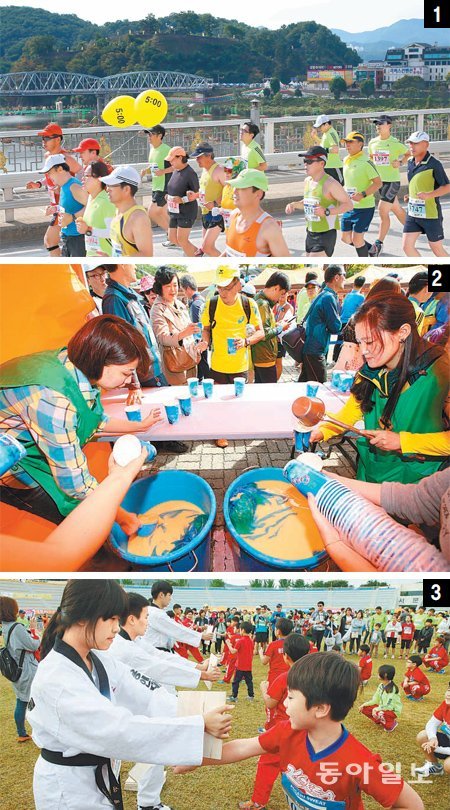 4일 열린 동아일보 2015 공주마라톤은 가을철 최고의 마라톤 축제였다. 달림이들이 유네스코 세계유산으로 지정된 공산성 건너편 도로를 질주하고 있다 ①. 레이스를 마친 참가자들이 공주시에서 제공한 밤막걸리를 마시고 있다 ②. 5km 부문에 참가한 경기 용인의 한 태권도장 어린이들이 출발 전 공주시민운동장에서 격파 시범을 보이고 있다 ③. 공주=김재명 base@donga.com·이훈구 기자