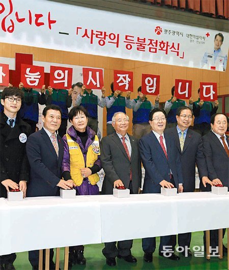 윤장현 광주시장(왼쪽에서 두 번째), 최상준 대한적십자사 광주전남지사 회장(가운데) 등이 23일 광주 북구 적십자사 강당에서 새해 적십자 회비 모금 시작을 알리는 ‘2016년 사랑의 등불’ 점화식을 갖고 있다.