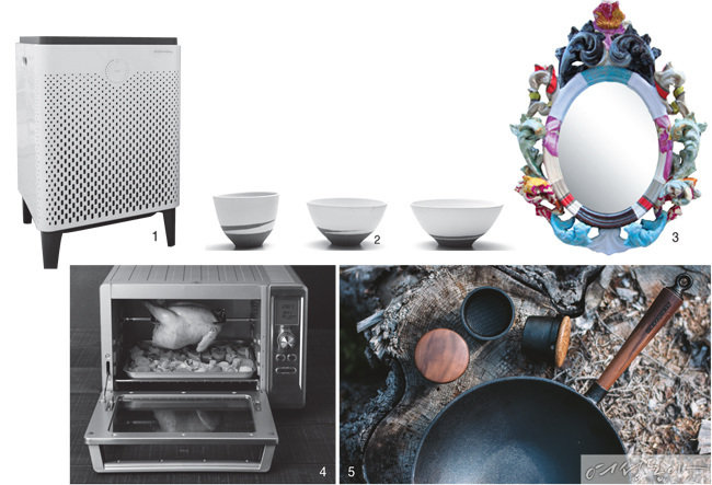 4 컨벡션, 토스트, 베이킹 등 12가지 조리 기능이 있는 컨벡션 토스터 오븐. 16만9천9백원 쿠진아트. by 문인영(요리 연구가) 5 스웨덴에서 수작업으로 만든 주물 쿠킹웨어. 소금 · 후추통 세트 8만9천원, 30cm 웍 29만5천원 스켑슐트. by 문인영(요리 연구가)