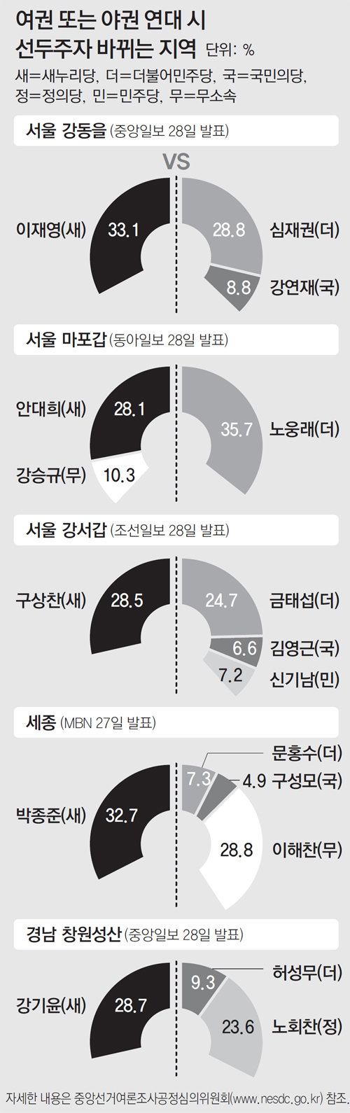 보수 분열 지역에 출마한 여권 성향 후보들에게도 연대와 분열은 승패를 가를 변수가 될 수 있다. 28일 동아일보 조사 결과 서울 마포갑에선 새누리당 안대희 후보는 28.1%를 얻어 더민주당 노웅래 의원(35.7%)에게 뒤지고 있다. 하지만 새누리당을 탈당한 뒤 무소속으로 출마한 강승규 전 의원의 지지율이 10.3%에 이른다. 여권 분열로 야당이 앞서는 모양새다.
