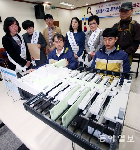 28일 광주 서구 광주시선거관리위원회 회의실에서 선거모니터단 등이 지켜보는 가운데 분류기를 통한 비례대표 정당 투표용지 분류를 시연하고 있다. 이번 4·13총선은 역대 최다인 21개 정당이 비례대표 후보자를 등록해 비례대표 투표용지가 역대 최장인 33.5cm(세로 길이)로 늘어났다.