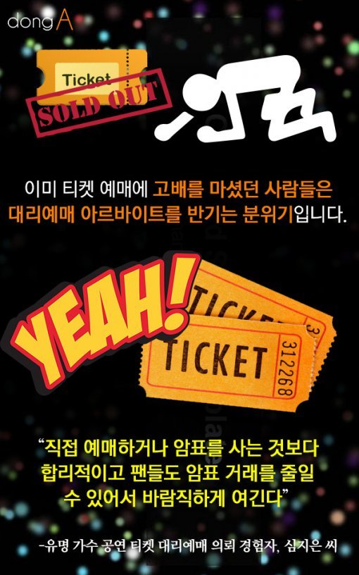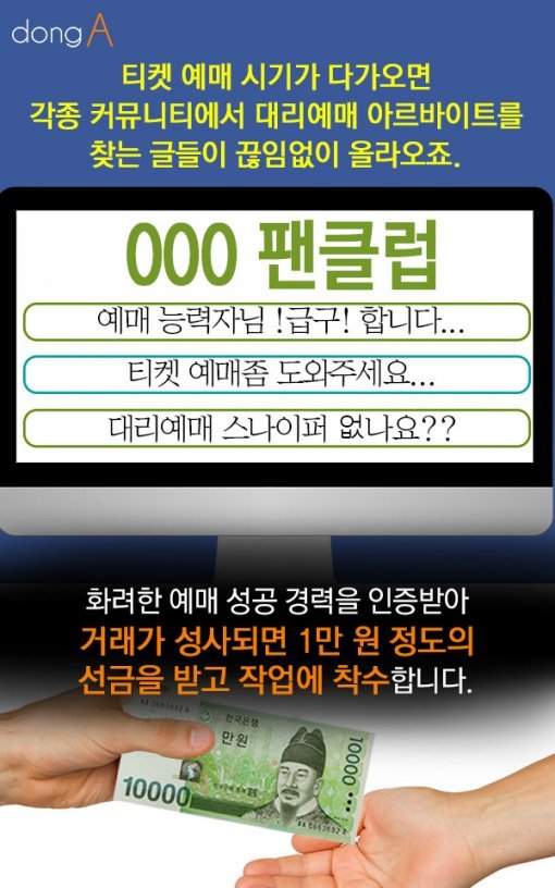 #.9 이미 티켓 예매에 고배를 마셨던 사람들은 대리예매 아르바이트를 반기는 분위기입니다. "직접 예매하거나 암표를 사는 것보다 합리적이고 팬들도 암표 거래를 줄일 수 있어서 바람직하게 여긴다" -유명 가수 공연 티켓 대리예매 의뢰 경험자, 심지은 씨