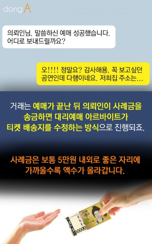 #.7 거래는 예매가 끝난 뒤 의뢰인이 사례금을 송금하면 대리예매 아르바이트가 티켓 배송지를 수정하는 방식으로 진행되죠. 사례금은 보통 5만원 내외로 좋은 자리에 가까울수록 액수가 올라갑니다.