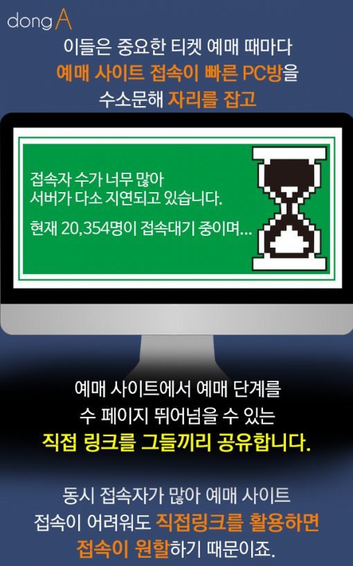 #.8 이들은 중요한 티켓 예매 때마다 예매 사이트 접속이 빠른 PC방을 수소문해 자리를 잡고 예매 사이트에서 예매 단계를 수 페이지 뛰어넘을 수 있는 직접 링크를 그들끼리 공유합니다. 동시 접속자가 많아 예매 사이트 접속이 어려워도 직접링크를 활용하면 접속이 원할하기 때문이죠.