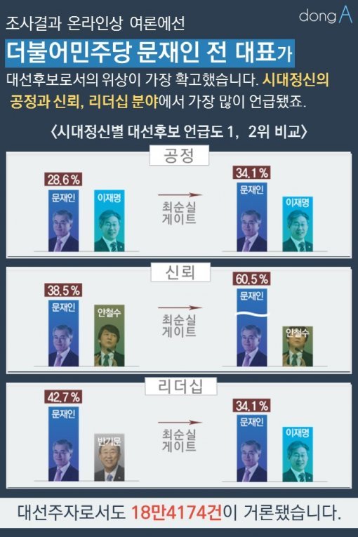 #.6 문 전 대표가 반기문 전 유엔 사무총장과의 양자 대결은 물론이고 국 민의당 안철수 전 상임공동대표까지를 포함한 3자 대결에서도 선두로 치고 나간 건 대선 시대정신에 비교적 잘 부합하고 있다는 방증이죠.