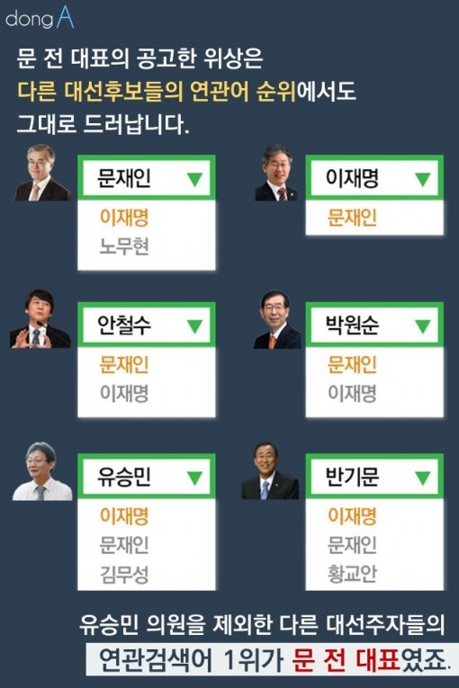 유승민 의원을 제외한 다른 대선주자들의 연관검색어 1위가 문 전 대표였죠.