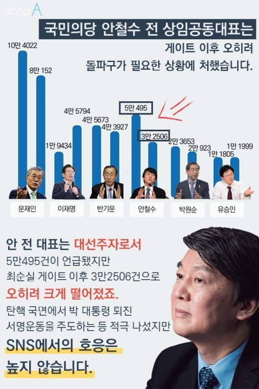 #.10 국민의당 안철수 전 상임공동대표는 게이트 이후 오히려 돌파구가 필요한 상황에 처했습니다. 안 전 대표는 대선주자로서 5만495건이 언급됐지만 최순실 게이트 이후 3만2506건으로 오히려 크게 떨어졌죠. 탄핵 국면에서 박 대통령 퇴진 서명운동을 주도하는 등 적극 나섰지만 SNS에서의 호응은 높지 않습니다.