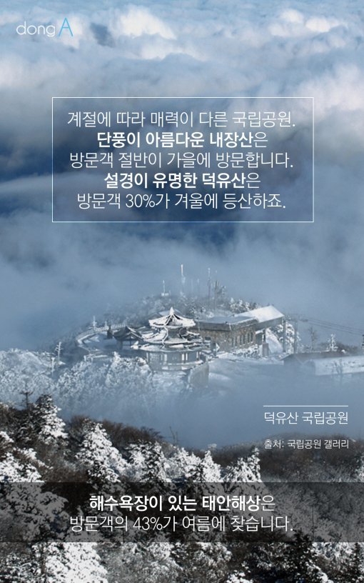 #7 계절에 따라 매력이 다른 국립공원. 단풍이 아름다운 내장산은 방문객 절반이 가을에 방문합니다. 설경이 유명한 덕유산은 방문객 30%가 겨울에 등산하죠. 해수욕장이 있는 태안해상은 방문객의 43%가 여름에 찾습니다.
