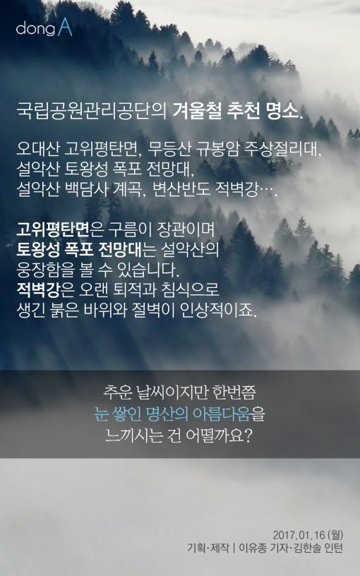 #10 국립공원관리공단이 추천하는 겨울철 명소. 오대산 고위평탄면, 무등산 규봉암 주상절리대, 설악산 토왕성 폭포 전망대, 설악산 백담사 계곡, 변산반도 적벽강…. 고위평탄면은 구름이 장관이며 토왕성 폭포 전망대는 설악산의 웅장함을 볼 수 있습니다. 적벽강은 오랜 퇴적과 침식으로 생긴 붉은 바위와 절벽이 인상적이죠. 이 겨울에 한번쯤 눈 쌓인 명산의 아름다움을 느끼시는 건 어떨까요?