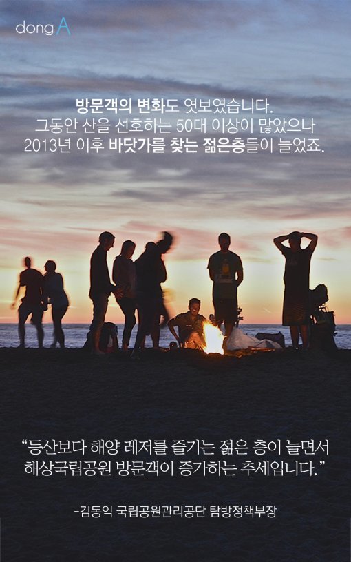 #6 방문객의 변화도 엿보였습니다. 그동안 산을 선호하는 50대 이상이 많았으나 2013년 이후 바닷가를 찾는 젊은층들이 늘었죠. -김동익 국립공원관리공단 탐방정책부장 "등산보다 해양 레저를 즐기는 젊은 층이 늘면서 해상국립공원이 방문객이 증가하는 추세입니다."