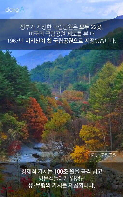 #2 정부가 지정한 국립공원은 모두 22곳. 미국의 국립공원 제도를 본 떠 1967년 지리산이 첫 국립공원으로 지정됐습니다. 경제적 가치는 100조 원을 훌쩍 넘고 방문객들에게 엄청난 유·무형의 가치를 제공합니다.