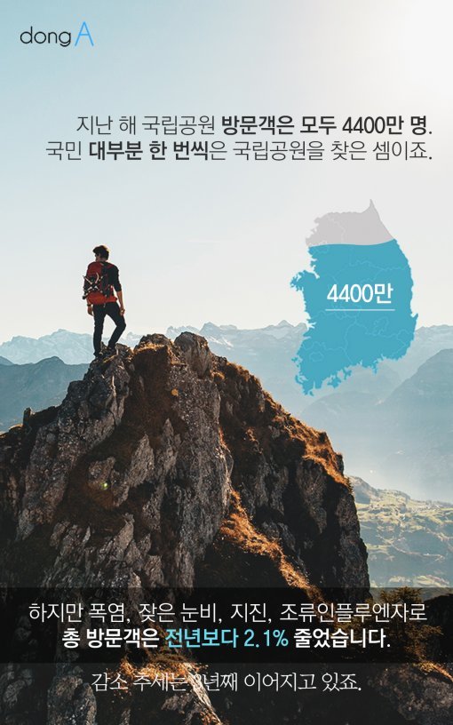 #3 지난해 국립공원 방문객은 모두 4400만 명. 국민 대부분 한 번씩은 국립공원을 찾은 셈이죠. 하지만 폭염, 잦은 눈비, 지진, 조류인플루엔자의 영향으로 총 방문객은 전년보다 2.1% 줄었습니다. 감소 추세는 3년째 이어지고 있죠.