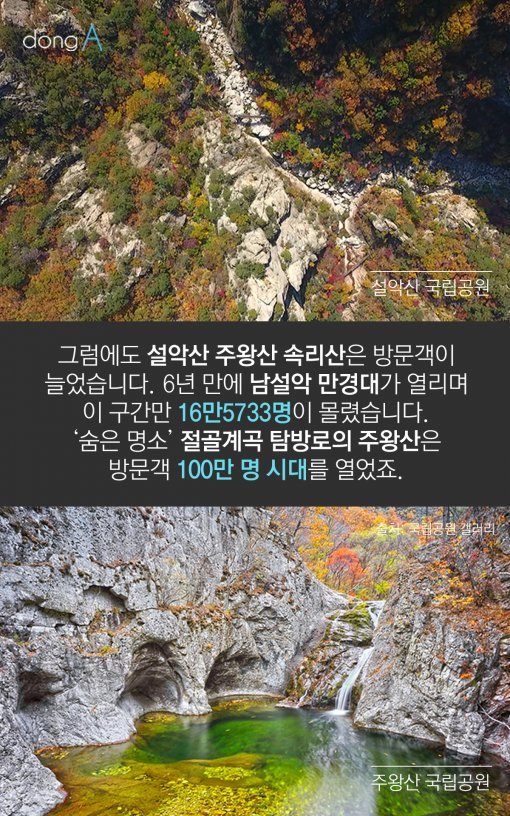 #4 그럼에도 설악산 주왕산 속리산은 방문객이 늘었습니다. 46년 만에 남설악 만경대가 열리며 이 구간만 16만5733명이 몰렸습니다. '숨은 명소' 절골계곡 탐방로의 주왕산은 방문객 100만 명 시대를 열었죠.