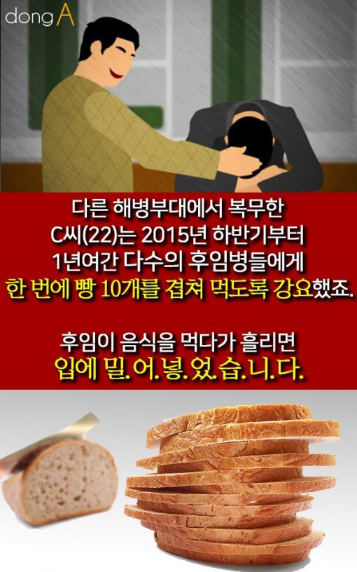 #4. 다른 해병부대에서 복무한 C씨(22)는 2015년 하반기부터 1년여간 다수의 후임병들에게 한 번에 빵 10개를 겹쳐 먹도록 강요했죠. 후임이 음식을 먹다가 흘리면 입에 밀어넣었습니다.