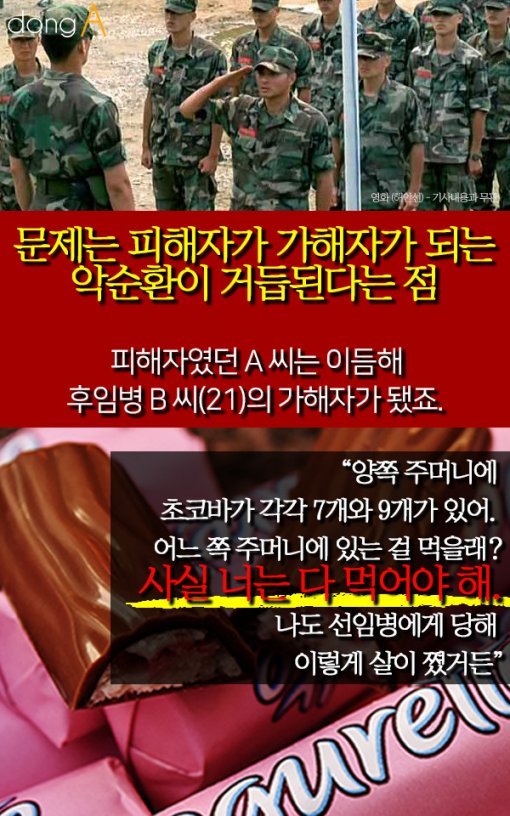 #7. 문제는 피해자가 가해자가 되는 악순환이 거듭된다는 점. 피해자였던 A 씨는 이듬해 후임병 B 씨(21)의 가해자가 됐죠. "양쪽 주머니에 초코바가 각각 7개와 9개가 있어. 어느 쪽 주머니에 있는 걸 먹을래? 사실 너는 다 먹어야 해. 나도 선임병에게 당해 이렇게 살이 쪘거든"