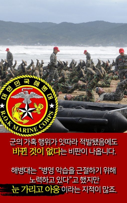 #9. 군의 가혹 행위가 잇따라 적발됐음에도 바뀐 것이 없다는 비판이 나옵니다. 해병대는 "병영 악습을 근절하기 위해 노력하고 있다"는 입장을 발표했지만 눈 가리고 아웅 이라는 지적이 많죠.