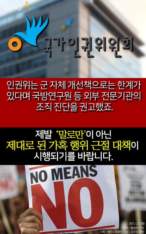 #10. 인권위는 군 자체 개선책으로는 한계가 있다며 국방연구원 등 외부 전문기관의 조직 진단을 권고했는데요. 제발 '말로만'이 아닌 제대로 된 가혹 행위 근절 대책이 시행되기를 바랍니다. 원본: 황성호 기자 기획-제작: 하정민 기자-김유정 인턴