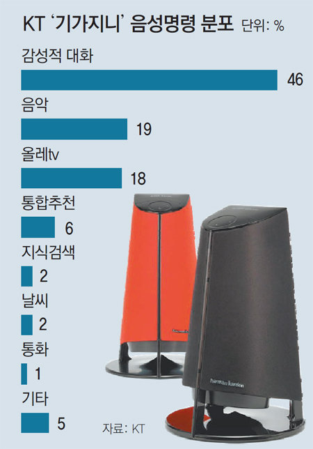 동아일보가 KT의 음성인식 AI 홈비서 ‘기가지니’ 이용자의 음성명령 통계를 분석한 결과 감성대화 명령어가 전체의 46%에 달했다. 음악 재생이 19%, 인터넷TV(IPTV)인 올레tv 시청 관련 명령어가 18%로 뒤를 이었다. 감성대화는 사용자가 “진짜 화난다” “나 예뻐?”와 같은 말을 하면 AI 기기가 그에 알맞은 대답을 하거나 영화나 음악 등 적절한 콘텐츠를 추천해주는 식으로 이뤄진다.