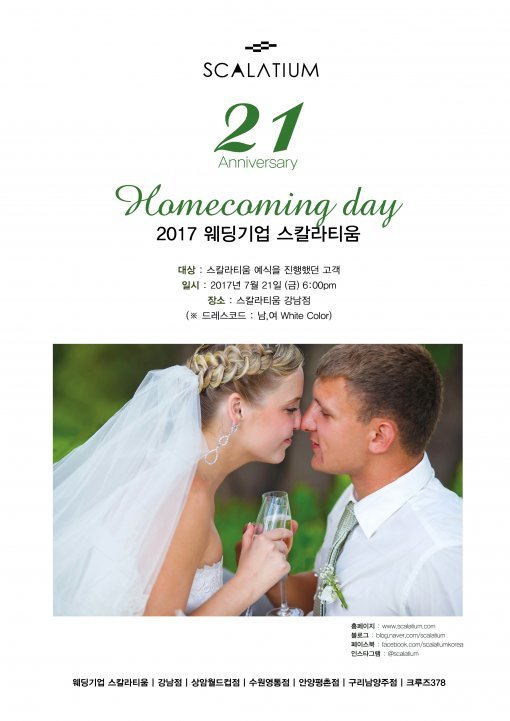웨딩문화를 통해 복합문화공간을 지향하는 스칼라티움이 올해 21주년을 맞았다. 이를 기념해 오는 21일 ‘2017 웨딩기업 스칼라티움 홈커밍데이’를 진행한다. 행사에는 약 1000명의 고객이 초청된다. ‘인연지기’라는 회사 슬로건 아래 스칼라티움에서 결혼식을 올린 신랑과 신부가 초대되며 ‘스칼라티움 멤버십 서비스’가 제공된다.