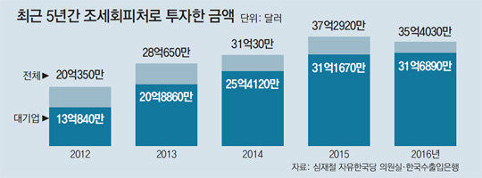 9일 국회 기획재정위원회 소속 심재철 의원(자유한국당)이 한국수출입은행에서 제출받은 자료에 따르면 지난해 대기업이 조세회피처 15곳에 직접 투자한 금액은 31억6890만 달러(약 3조6642억 원)로 2012년(13억840만 달러)보다 18억6050달러(142.2%) 늘었다.