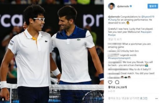 조코비치는 22일 자신의 인스타그램에 정현과 나란히 어깨동무한 사진을 올리며 “정현의 환상적인 퍼포먼스를 축하한다. 그는 승리할 자격이 있었다”고 적었다.