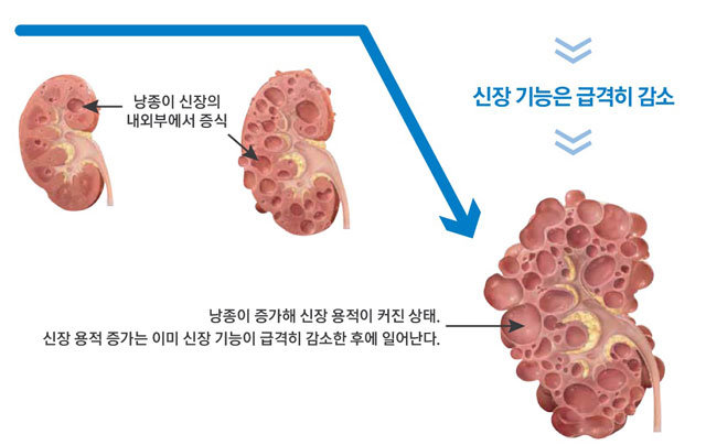 문제는 낭종이 생기기 전까지 증상이 느껴지지 않는다는 점이다. 신장 기능이 나빠진 뒤에야 다낭성신장병임을 알게 되는 셈이다. 이 때문에 다낭성신장병 환자 10명 중 7명은 말기 신부전으로 악화해 신장 투석이나 신장 이식을 받아야 한다. 신장 투석을 받다 보면 사회생활이 힘들어진다.