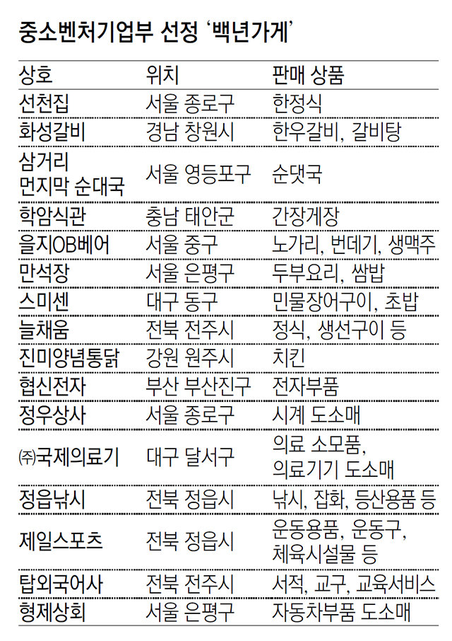 중기부는 13일 ‘선천집’을 비롯한 16개 업체를 1차 백년가게로 선정해 발표했다. 평가위원회가 서류심사와 현장평가를 통과한 20개 신청 업체를 대상으로 평판도 등을 종합해 최종 선정했다. 도소매업 7개, 음식업 9개다.