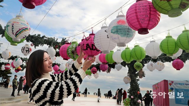 1일 부산 해운대 해수욕장 이벤트 광장을 찾은 시민이 새해 소망을 적은 등을 달고 있다.
