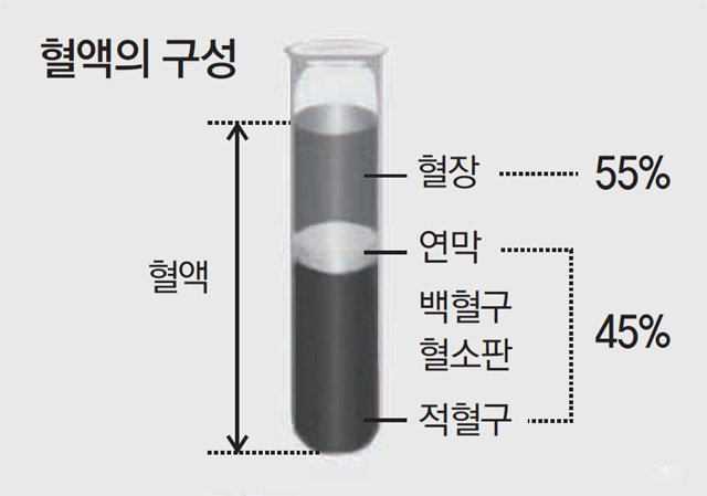 사람의 혈액은 보통 적혈구가 42%, 백혈구가 1%를 차지한다. 혈구를 뺀 나머지 액체가 혈장이다. 혈장은 약 90%의 물과 7∼8%의 단백질, 2%의 기타 성분으로 구성된다.