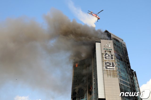 오전 1시 현재 외벽으로 번지던 불은 일부 잡혔지만, 강한 바람 때문에 여전히 화재 진압에 어려움을 겪고 있다. 불씨가 날리면서 왕복 10차로 도로를 사이에 두고 있는 맞은편 대형마트 옥상에도 한때 불이 옮겨 붙었지만, 다행히 금방 진화되면서 추가 피해로 이어지진 않았다.
