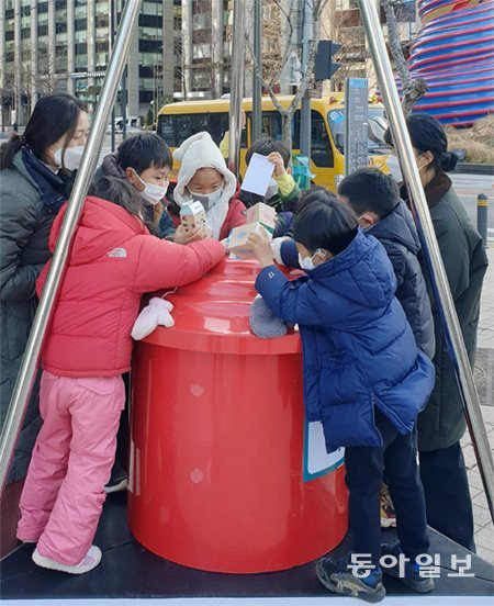 8일 오전 서울 영등포구 도심형 숲유치원 ‘꿈땅자연학교’ 원생들이 올해 어린이날 우유팩으로 만들었던 저금통에 모아온 돈을 서울 종로구 동아미디어센터 앞 자선냄비에 기부하고 있다. 꿈땅자연학교 원생들은 어려운 이웃들을 위해 사용해 달라며 14년째 이 자선냄비에 기부해왔다.