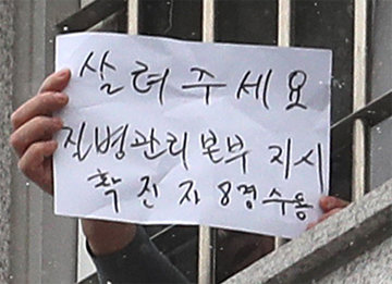 이 수감자는 지난해 12월 29일 동부구치소 쇠창살 틈 사이로 “살려주세요. 질병관리본부 지시. 확진자 8명 수용”이라고 적힌 종이를 내밀어 흔들었다. 또 “확진자 한 방에 8명씩 수용. 서신(편지) 외부 발송 금지”라고 쓴 종이도 번갈아 내밀었다.