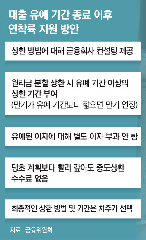 금융위는 이번 조치 종료 이후에도 대출자가 한꺼번에 원리금을 갚아야 하는 부담이 없도록 다양한 장기·분할 상환 방법 등을 담은 ‘연착륙 지원 5대 원칙’을 마련했다. 유예한 원리금의 상환 방법과 기간을 차주가 선택할 수 있도록 한 것이 핵심이다.