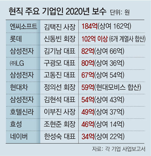김택진 엔씨소프트 대표가 지난해 184억 원의 보수를 받은 것으로 나타났다. 퇴직자를 제외한 현직 주요 기업인(상장사 기준) 중 ‘연봉왕’에 오를 것이 유력하다. 퇴직자를 포함하면 정몽구 현대자동차그룹 명예회장이 퇴직금을 포함해 567억 원을 받아 가장 많았다.