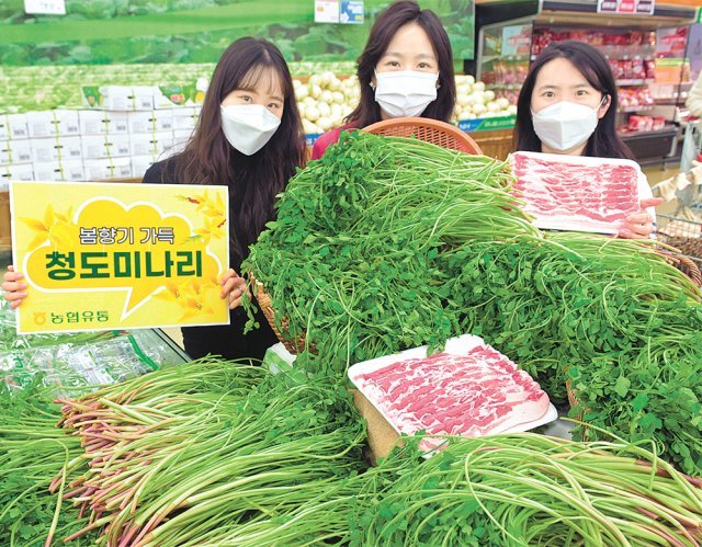 17일 서울 서초구 농협하나로마트 양재점에서 모델들이 올해 처음 출하된 청도 미나리를 선보이고 있다. 청도 미나리는 연하고 향이 좋아 무침과 전, 겉절이 등 다양한 요리를 만드는 데 사용된다.