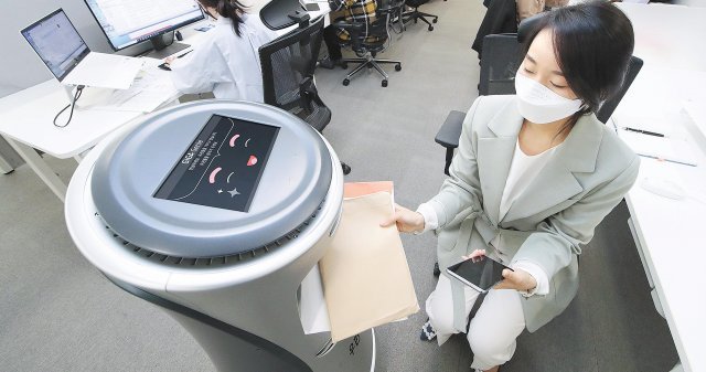 KT는 서울 종로구 광화문 사옥 근무 임직원을 대상으로 AI 로봇이 자리까지 우편물을 배송해주는 ‘AI 로봇 우편배송 서비스’를 선보였다고 18일 밝혔다. KT 직원이 AI 로봇으로부터 우편물을 수령하고 있다.