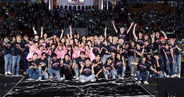 20일 경기 수원월드컵경기장에서 ‘SMTOWN LIVE 2022’ 공연을 마친 가수들이 기념사진을 찍었다. SM엔터테인먼트 제공